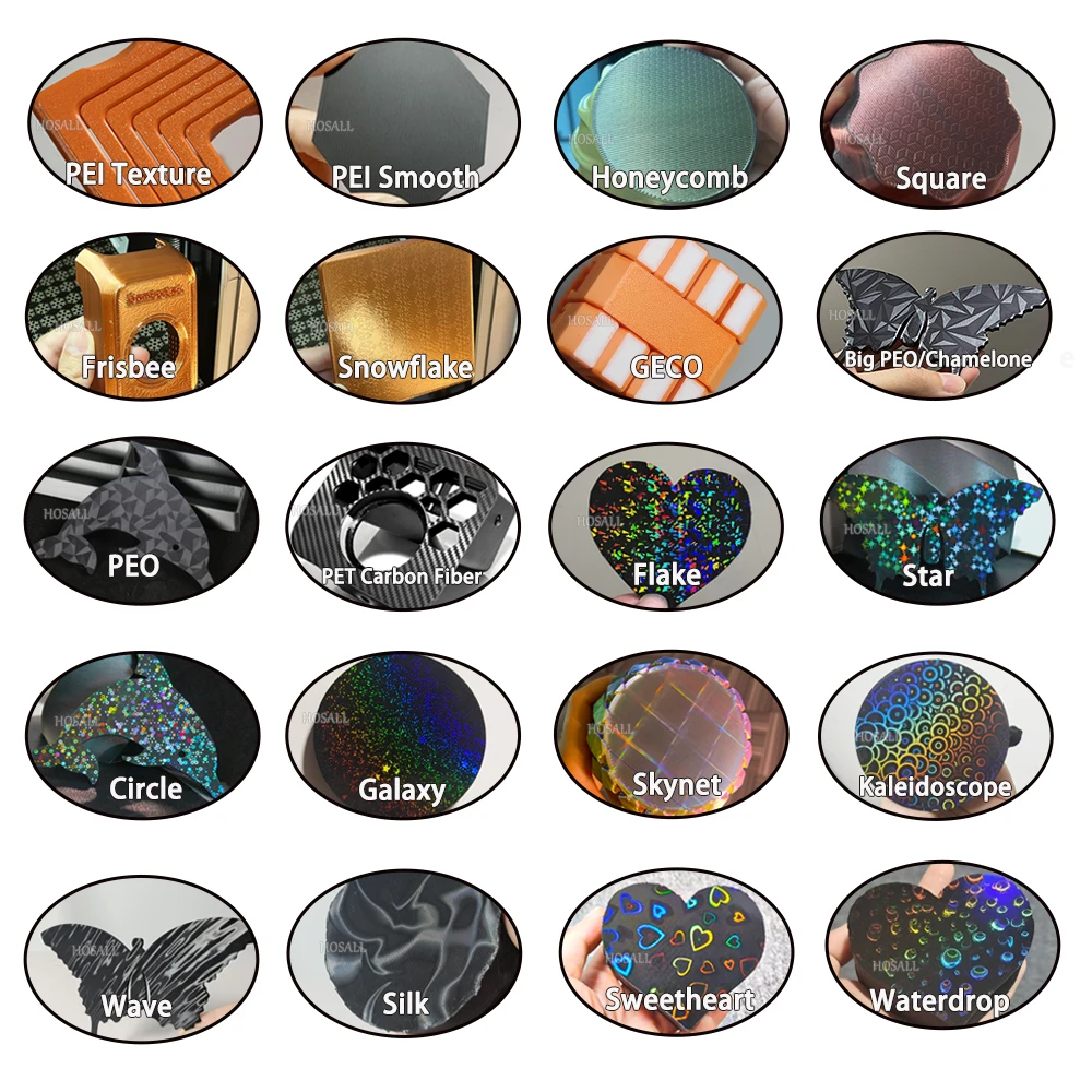 Types:Cool Plate/Double Sided PEI Textured/Honeycomb PEI/ PEI Smooth /PEO PET Smooth /Coloful Holographic Sring Steel Build Plate.
